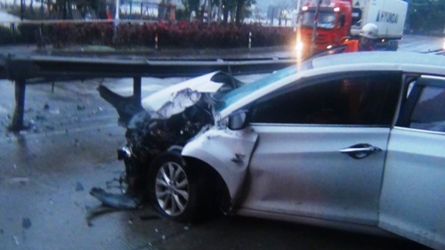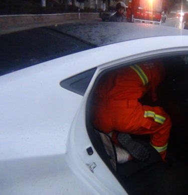 中队到达现场后,发现一辆轿车由于刹车不及撞上隔离带,事故车辆横在路中间,小轿车车头严重受损变形,现场一片狼藉,整个路面撒满了碎玻璃片,驾驶室车门因变形无法打开,驾驶员右腿被方向盘与驾驶座卡住,情况十分危急。