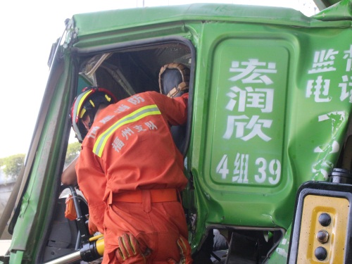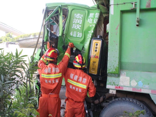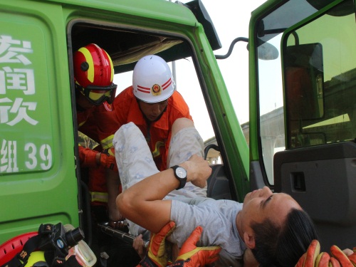 中队到场后看到一辆绿色货车斜停在路口绿化带上,且快安中队也已到场。经勘察发现:该货车车头已严重变形,一人被困在驾驶室内,被困人员的左脚被压扁的车头夹住无法动弹。伤者大量失血,不时发出痛苦的呻吟声。了解情况后,中队指挥员立即下达命令,分成两组人员展开行动:一组与快安分别从不同方向利用液压破拆组合工具对事故车辆进行剪切、扩张,展开施救,另一组人员负责现场警戒,防止出现二次交通事故。经过30分钟的紧张救援,被困者被成功救出,移交现场医护人员送往医院进行救治。