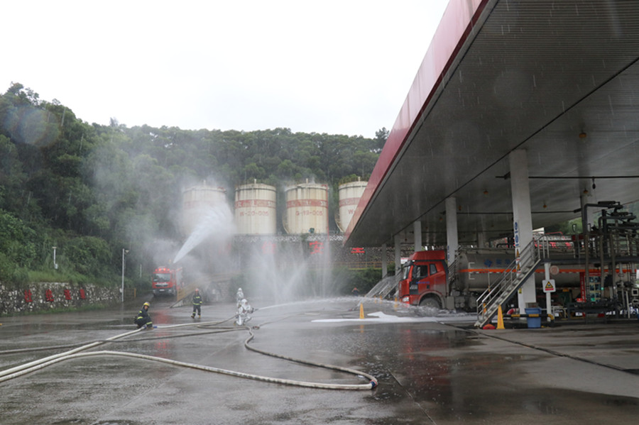 在指挥员的号令下,各组按照职责分工有序进行演练。警戒疏散组及时拉起警戒线,及时疏散人员到安全地段;通信联络组主要负责对外联络。泡沫覆盖组立即展开灭火战斗任务。辖区消防中队投入三部水罐车,出三门消防炮进行主攻灭火任务,同时设置人员观察哨,密切关注现场情况变化。经过30多分钟各参战单位的协作战斗,成功完成这次演练任务。