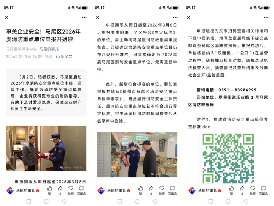 为加强消防安全重点单位管理,3月3日,马尾大队在马尾区官方微信公众号“马尾的事”发布消防安全重点单位申报、调整信息。