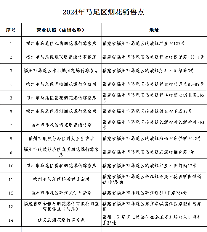2月3日记者从区烟花办获悉,今年马尾区共设置14处零售网点其中常年零售网点12个具体地点如下:
