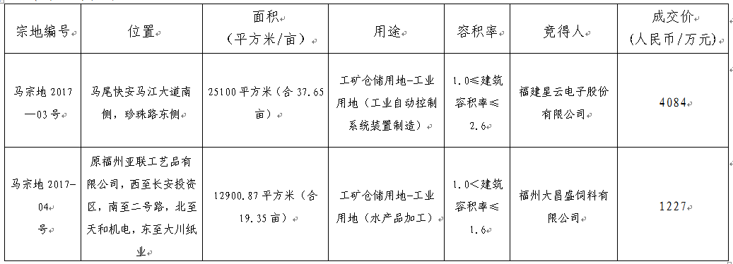根据福州市马尾区国土资源局《关于2017年第三次公开出让国有建设用地使用权的公告》(编号:榕马土让[2017]03号),我局于2017年9月4日上午举行土地公开出让活动,现将国有建设用地使用权出让结果公布如下: