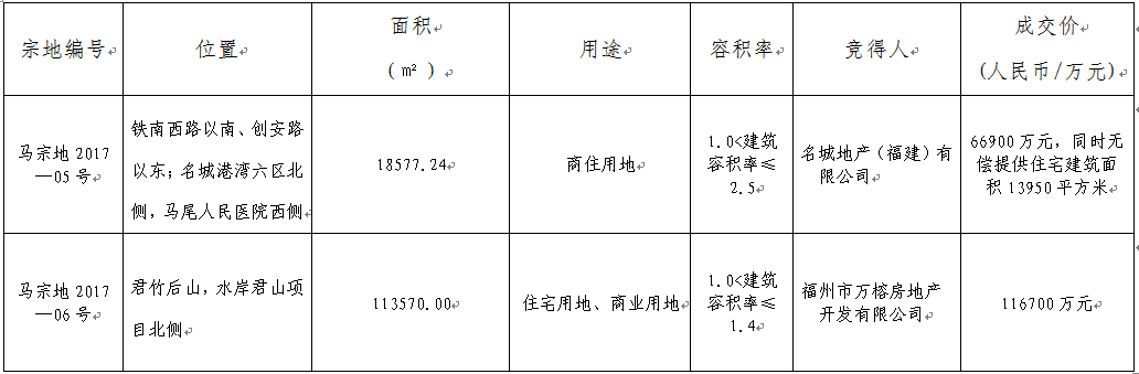 根据福州市马尾区国土资源局《关于2017年第四次公开出让国有建设用地使用权的公告》(编号:榕马土让[2017]04号),我局于2017年9月1日上午举行土地拍卖交易会,现将国有建设用地使用权出让结果公布如下: