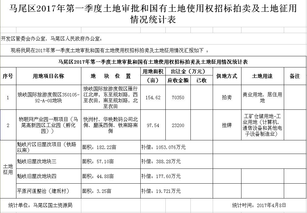马尾区2017年第一季度土地审批和国有土地使用权招标拍卖及土地征用情况统计表