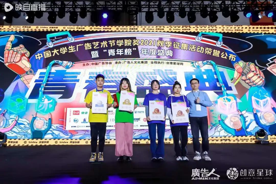 12月12日,第28届中国国际广告节中国大学生广告艺术节学院奖2021秋季征集活动荣誉公布暨“青年榜”年度盛典在厦门国际会展中心圆满落幕。阳光学子凭借极具创意的作品在大赛中脱颖而出,摘得2金1银,其中2019级广播电视编导专业严彬睿主创的《我的潮酷我做主》获得2021秋季学院奖常规赛金奖、企业奖品诺“PINO新风尚”金奖;2020级广播电视编导专业张泽瑞主创的《花YOUNG》获得2021秋季学院奖常规赛银奖。2金1银的赛事成绩为我校在该项赛事上的历史突破。