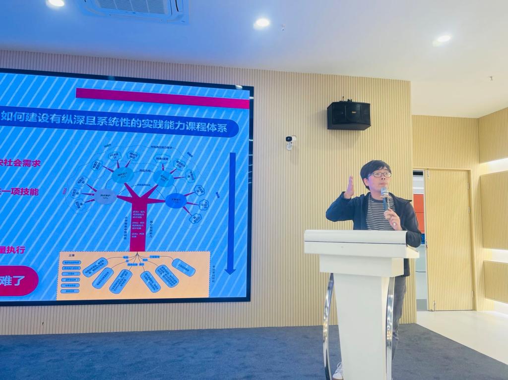 人工智能学院副院长罗成立通过解读国标三大原则、特点、难点等方面强调各教学单位要切实把握“突出学生中心”、“突出产业导向”、“突出持续改进”基本原则,并以专业为范例分析实战实训区别,讲解培养方案制定与执行的关键点、突破点,深入解析如何设计纵深且系统的实践能力课程体系,助力双师双能型师资团队构建。