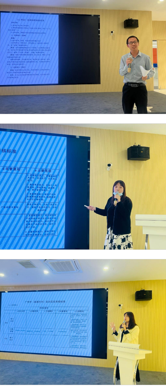 教务处常务副处长兰石财、副处长陈博文分别围绕实训育人(双师)、实战育人(双能)考核标准进行深入解读,新媒体学院院长蒋湘玉分享了新媒体学院广告学(直播方向)的实训实战考核标准,帮助在场学员更明晰实训实战考核标准的制定和落地。
