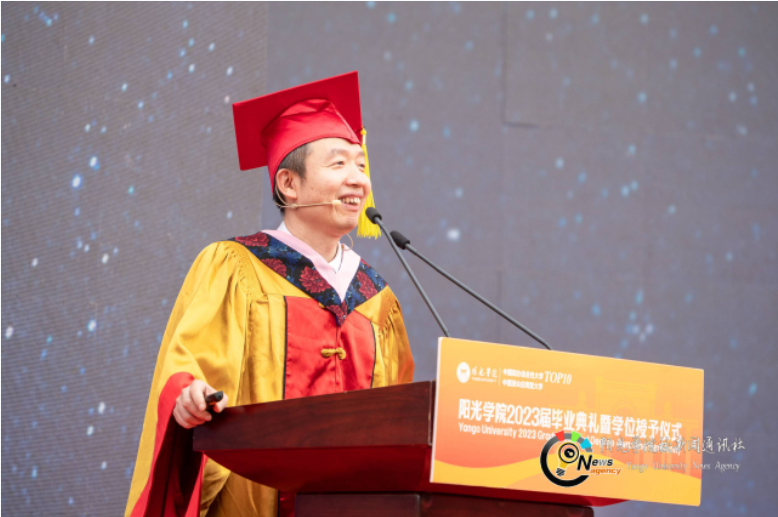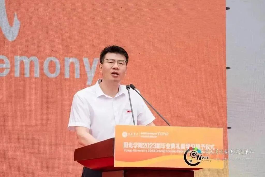 “回首四年,阳光学院见证了学子们的努力、汗水和坚持,同时,同学们也收获了成长与进步。”人工智能学院教授冯奎胜博士作为教师代表发言。他表示,乐观、积极进取的人生态度是学子面对未来挑战时最强大的武器。为此,他为学子们提出两点建议: 第一,坚持梦想和追求卓越,善于在自己的身上挖掘自身优势和潜力;第二,勇于面对挑战和逆境,始终怀揣着阳光的心态,勇往直前,乐观地面对人生的各种变数。