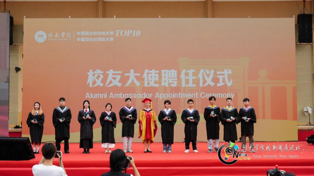校友大使们依次上台,张红霞副校长授予校友大使戒指,五个“最”荣誉嘉奖者在老师同学们的见证下接受专属表彰。