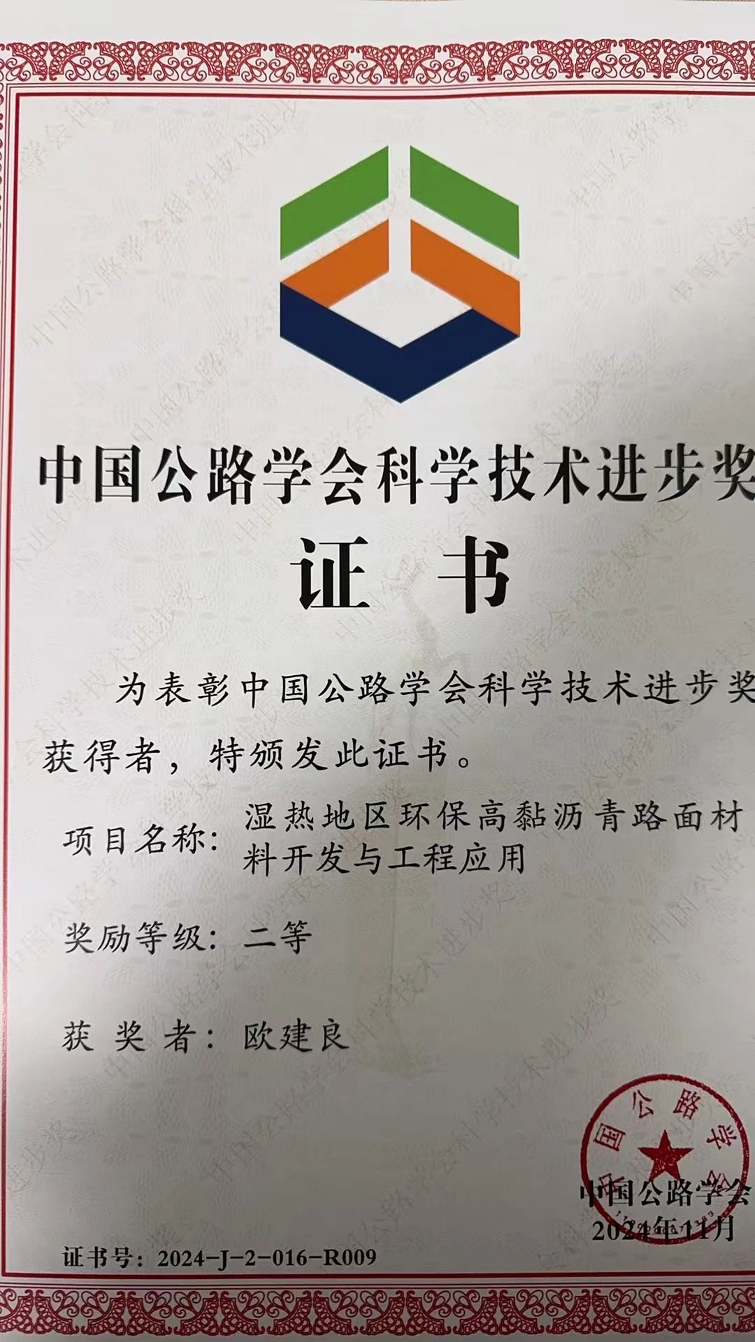 近日,中国公路学会发布“2024年度中国公路学会科学技术奖”获奖结果,由阳光学院欧建良教授与湖南大学、湖南湘汉中宇建设有限公司、中建五局建设发展有限公司、湖南力天建筑工程有限公司、湖南隆吉工程建设有限公司、湖南富凯建设有限公司等单位共同研究的项目《湿热地区环保高黏沥青路面材料开发与工程应用》(阳光学院为第一单位)荣获本届中国公路学会科学技术奖二等奖。