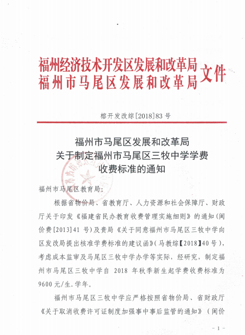 附件:《福州市马尾区发展和改革局关于制定福州市马尾区三牧中学学费收费标准的通知》(榕开发改综【2018】83号)