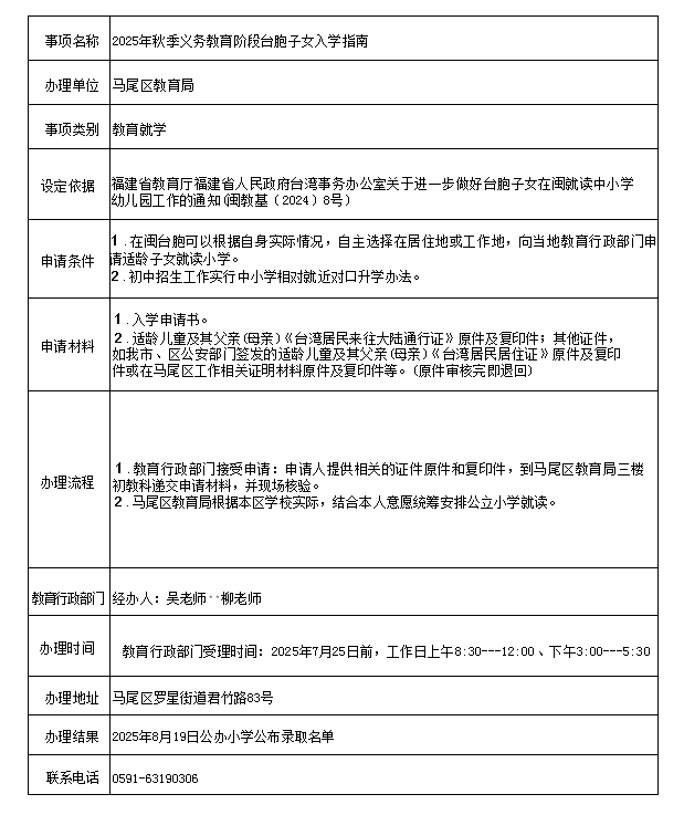马尾区教育局关于2025年义务教育阶段台胞子女入学指南