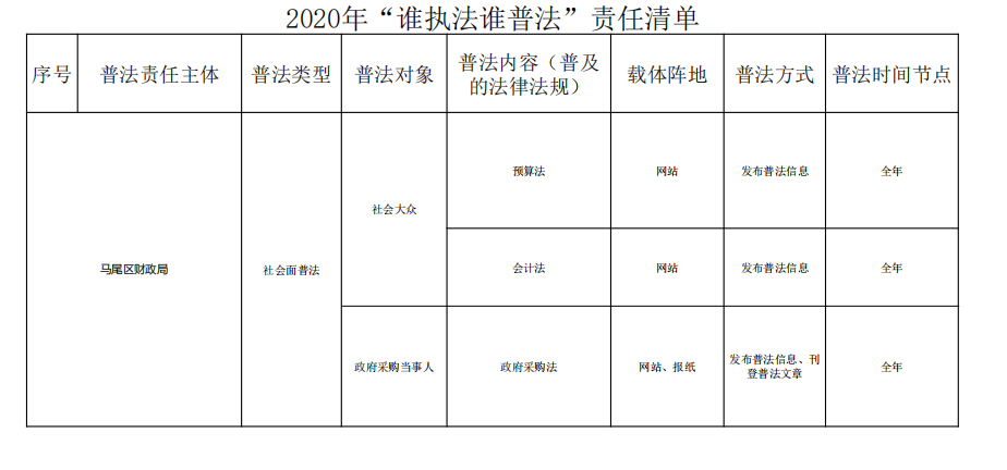 马尾区财政局2020年“谁执法谁普法”责任清单