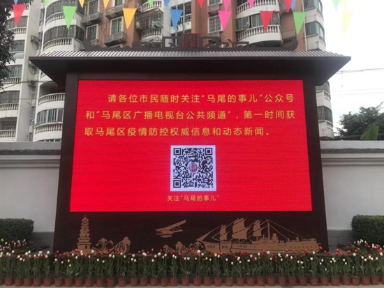 (记者 何鋆棽 文/图 )“请各位市民随时关注‘马尾的事儿’公众号和‘马尾区广播电视台公共频道’第一时间获取马尾区疫情防控权威信息和动态新闻。”1月28日,记者在马尾区港口路电信大楼、罗星塔公园门口的LED大屏上看到,关于防控疫情的宣传信息在不断地滚动播放。
