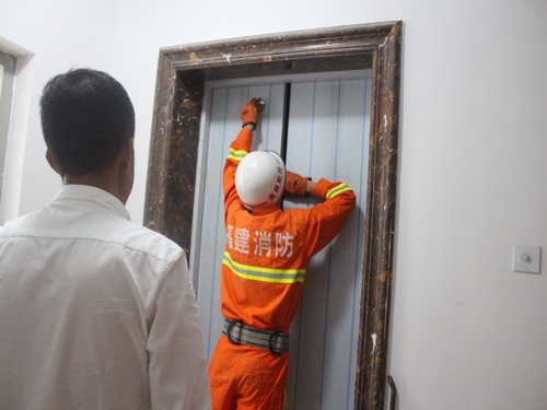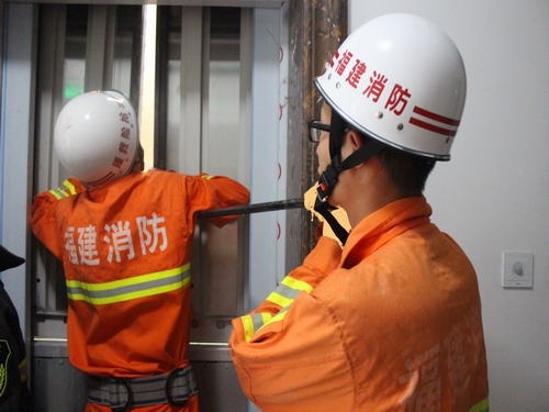 到场后,中队指挥员通过与小区物业负责人、报警人联系,找到事故电梯。救援过程中,中队指战员先对电梯内部被困人员进行喊话,安抚情绪;并询问其情况,得知有两人被困在电梯里面。据现场了解情况后,现场指战员利用三角电梯钥匙将电梯外门打开,轿厢停在二至三楼中间,无法直接打开电梯内门。中队指战员和小区物业负责人迅速跑上楼顶电梯机房切断电源,通过盘车下降轿厢,将电梯轿厢牵引至一楼后,利用电台通知一楼等候的队员利用电梯三角钥匙重新将电梯门开启,经过约二十余分钟的紧张抢救,电梯门终于被打开,被困者被成功救出。