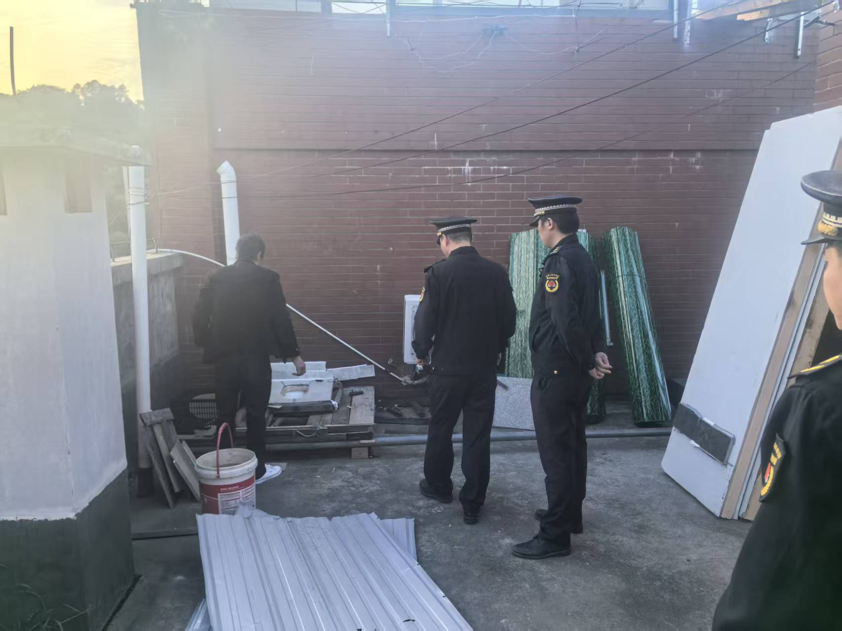 日前,亭江中队接到群众投诉,反映亭江镇某小区楼顶存在私自加盖厕所的违建行为,严重影响小区居住环境与安全。接到投诉后,执法人员第一时间赶赴现场实地查看,核实违建的具体位置、结构及占地面积,同时积极联系镇街与小区负责人,全面了解违建的相关情况。