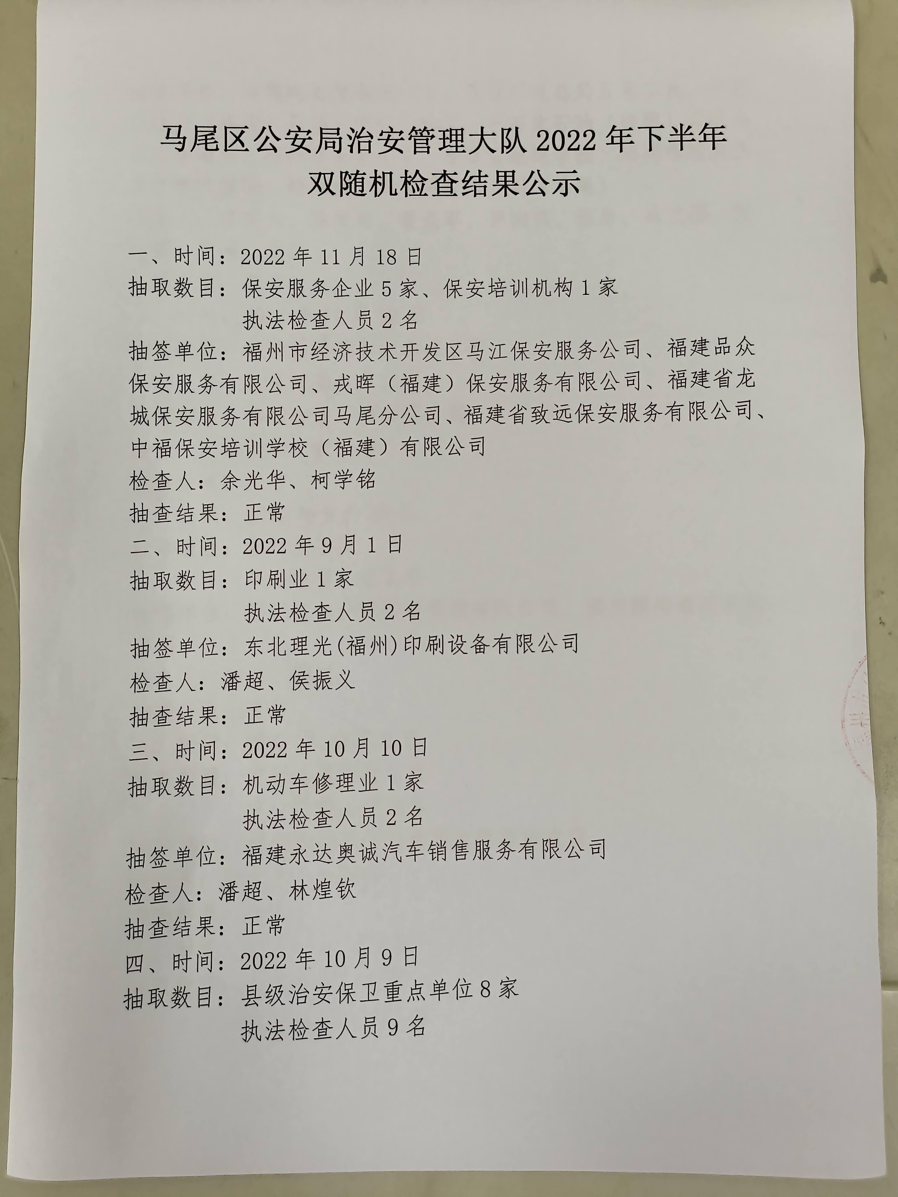 马尾区公安局治安管理大队2022年下半年双随机检查结果公示