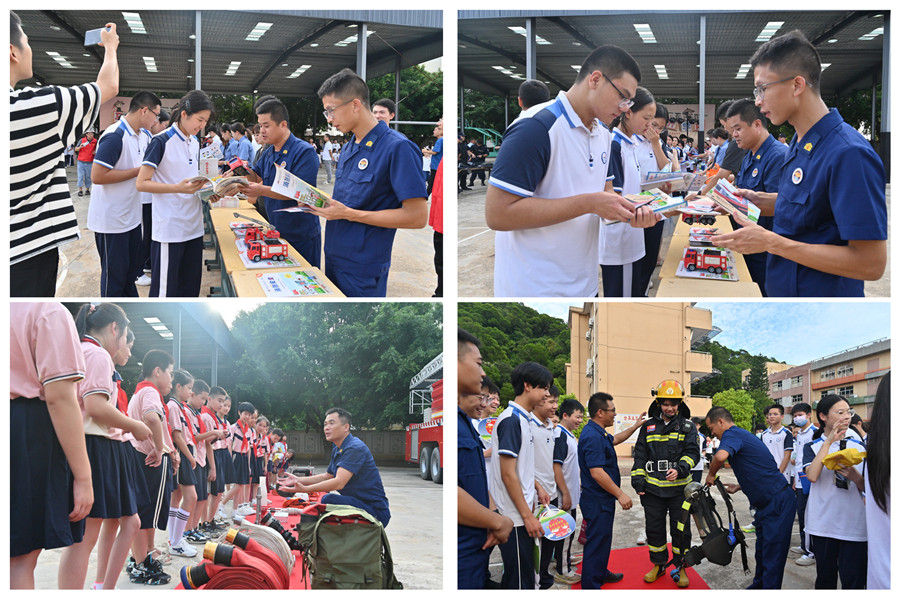 在集中宣传区域,宣讲员们围绕“怎样防止火灾发生”、“校园常见火灾隐患”、“报警的方式方法”、“如何在火灾中正确逃生”、“常用灭火器分类及使用方法”等内容进行了详细讲解,并向学生们发放《校园消防安全》书籍、消防车模等宣传材料。