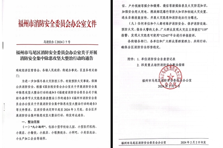 为深刻汲取江西新余市“1·24”特别重大火灾事故、河南南阳市“1·19”重大火灾事故教训,加强冬春火灾防控工作,2月2日,马尾区消防安全委员会办公室发布消防安全集中除患攻坚大整治行动的通告,发动各级、各单位积极参与除患攻坚大整治行动。