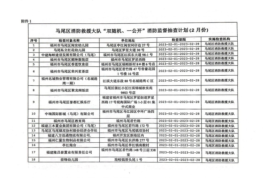 附件: 1. 马尾区消防救援大队“双随机、一公开”消防监督抽查计划(2月份)