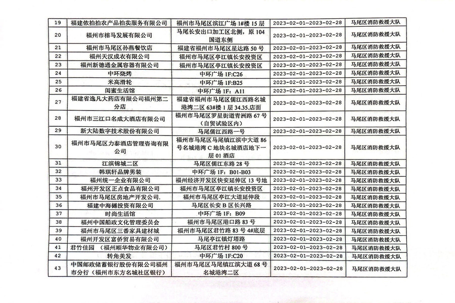 为确保火灾形势持续平稳,全面推行“双随机、一公开”消防监管模式,马尾区消防救援大队2月份对管辖范围内单位履行法定消防安全职责情况进行监督抽查,并定期公示抽查单位和检查结果,提醒社会单位更加自觉履行单位消防安全主体责任,做到“三自主、两公开、一承诺”,即自主评估风险、自主检查安全、自主整改隐患,向社会公开消防安全责任、管理人,并承诺本场所不存在突出风险或者已经落实防范措施等。现按照“双随机、一公开”消防监管工作要求,将2月有关信息公示如下: