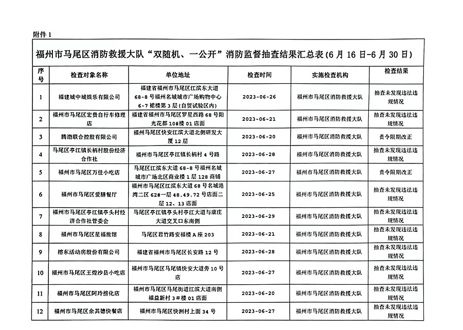 附件:1.福州市马尾区消防救援大队“双随机、一公开”消防监督抽查结果汇总表(6月16日-6月30日)