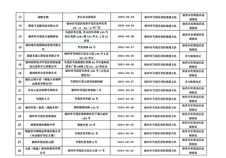 按照福建省消防救援总队《关于开展“双随机、一公开”监督抽查工作的通知》文件要求,2023年6月16日至30日,福州市马尾区消防救援大队对消防监督系统中随机抽取的单位进行了检查,现将检查结果向社会公示,具体抽查结果公示如下:
