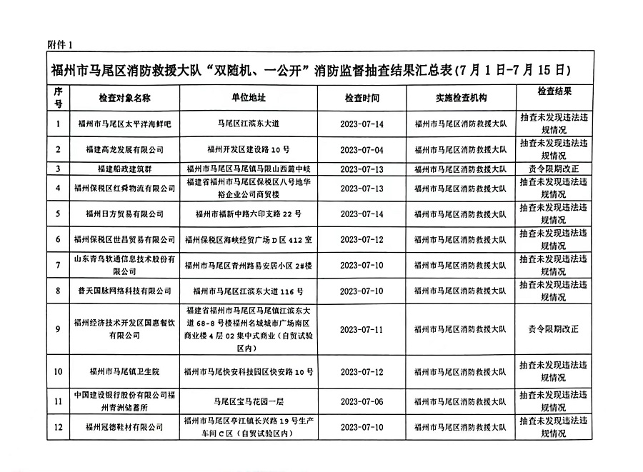 附件:1.福州市马尾区消防救援大队“双随机、一公开”消防监督抽查结果汇总表(7月1日-7月15日)