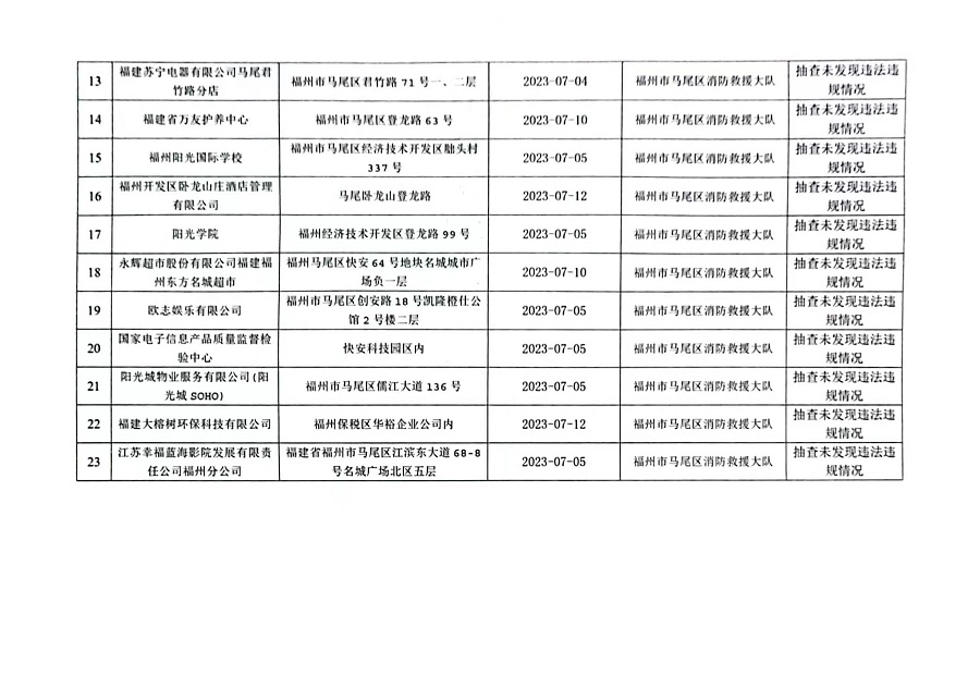 按照福建省消防救援总队《关于开展“双随机、一公开”监督抽查工作的通知》文件要求,2023年7月1日至15日,福州市马尾区消防救援大队对消防监督系统中随机抽取的单位进行了检查,现将检查结果向社会公示,具体抽查结果公示如下: