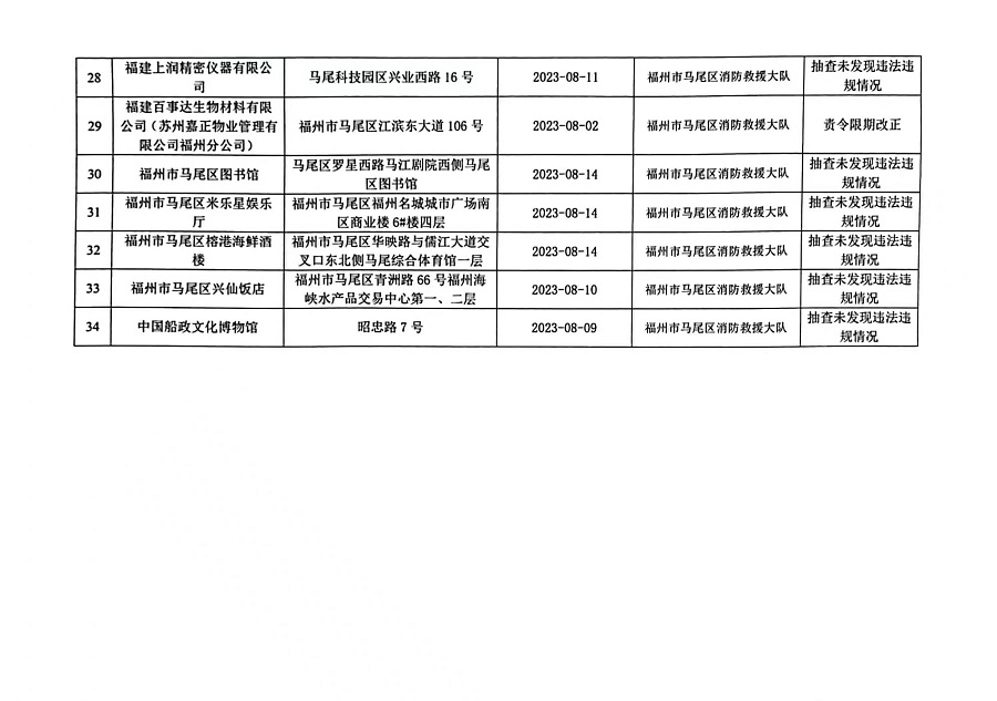 按照福建省消防救援总队《关于开展“双随机、一公开”监督抽查工作的通知》文件要求,2023年8月1日至15日,福州市马尾区消防救援大队对消防监督系统中随机抽取的单位进行了检查,现将检查结果向社会公示,具体抽查结果公示如下:
