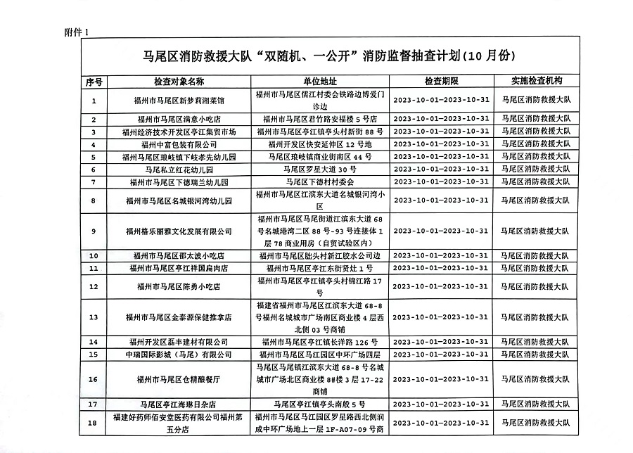 附件: 1. 马尾区消防救援大队“双随机、一公开”消防监督抽查计划(10月份)