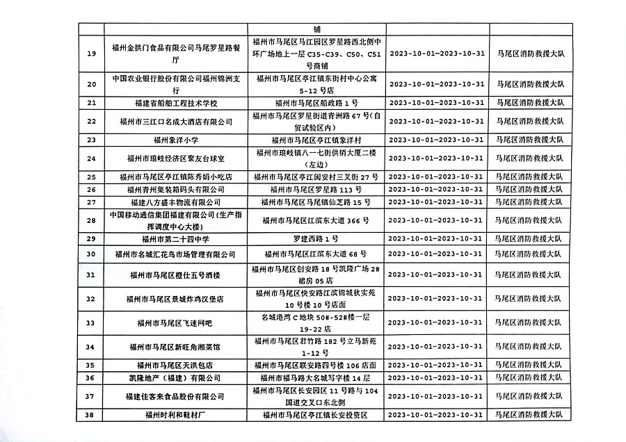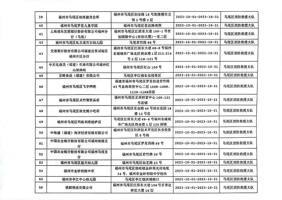 为确保火灾形势持续平稳,全面推行“双随机、一公开”消防监管模式,马尾区消防救援大队10月份对管辖范围内单位履行法定消防安全职责情况进行监督抽查,并定期公示抽查单位和检查结果,提醒社会单位更加自觉履行单位消防安全主体责任,做到“三自主、两公开、一承诺”,即自主评估风险、自主检查安全、自主整改隐患,向社会公开消防安全责任、管理人,并承诺本场所不存在突出风险或者已经落实防范措施等。现按照“双随机、一公开”消防监管工作要求,将10月有关信息公示如下: