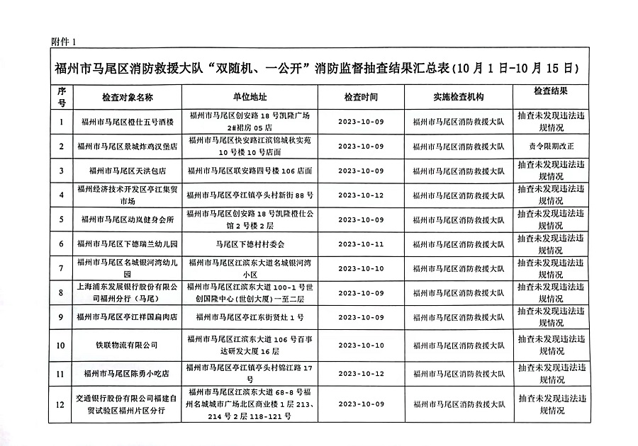 附件:1.福州市马尾区消防救援大队“双随机、一公开”消防监督抽查结果汇总表(10月1日-10月15日)