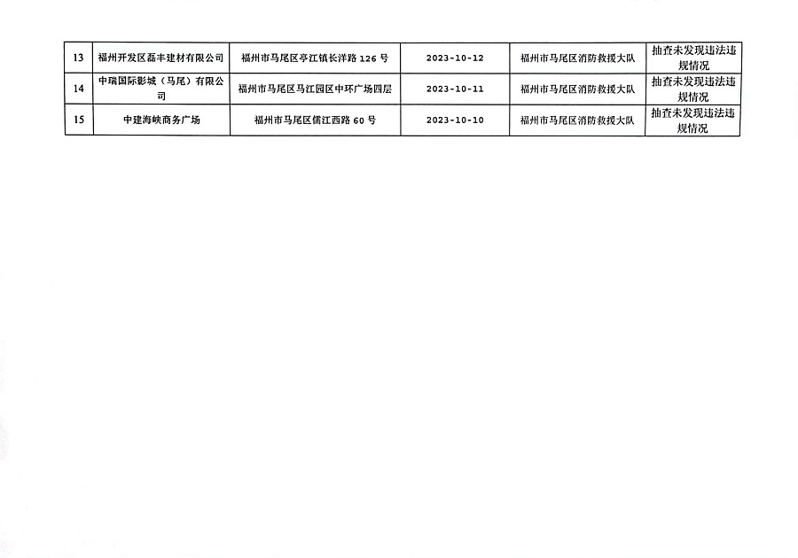 按照福建省消防救援总队《关于开展“双随机、一公开”监督抽查工作的通知》文件要求,2023年10月1日至15日,福州市马尾区消防救援大队对消防监督系统中随机抽取的单位进行了检查,现将检查结果向社会公示,具体抽查结果公示如下: