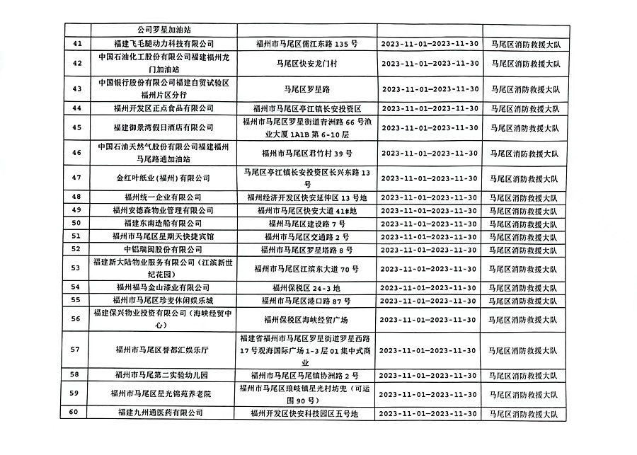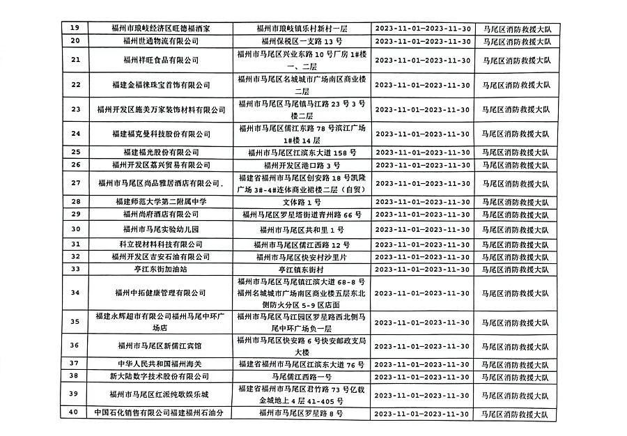 为确保火灾形势持续平稳,全面推行“双随机、一公开”消防监管模式,马尾区消防救援大队11月份对管辖范围内单位履行法定消防安全职责情况进行监督抽查,并定期公示抽查单位和检查结果,提醒社会单位更加自觉履行单位消防安全主体责任,做到“三自主、两公开、一承诺”,即自主评估风险、自主检查安全、自主整改隐患,向社会公开消防安全责任、管理人,并承诺本场所不存在突出风险或者已经落实防范措施等。现按照“双随机、一公开”消防监管工作要求,将11月有关信息公示如下: