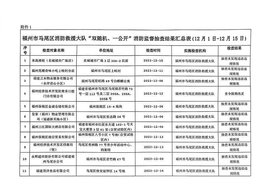 附件:1.福州市马尾区消防救援大队“双随机、一公开”消防监督抽查结果汇总表(12月1日-12月15日)