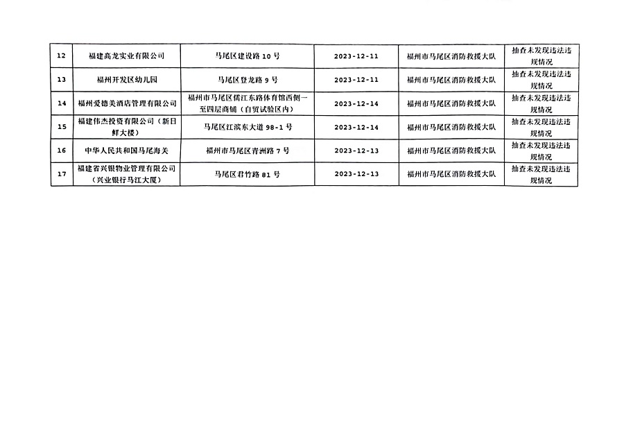 按照福建省消防救援总队《关于开展“双随机、一公开”监督抽查工作的通知》文件要求,2023年12月1日至15日,福州市马尾区消防救援大队对消防监督系统中随机抽取的单位进行了检查,现将检查结果向社会公示,具体抽查结果公示如下: