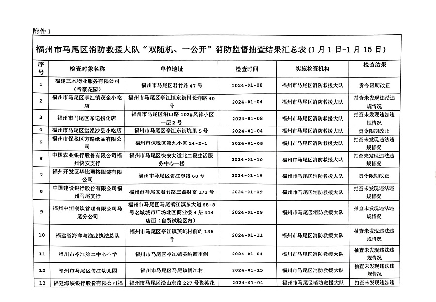 附件:1.福州市马尾区消防救援大队“双随机、一公开”消防监督抽查结果汇总表(1月1日-1月15日)
