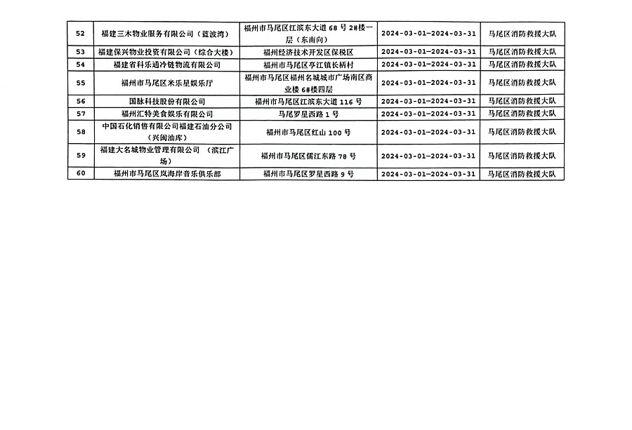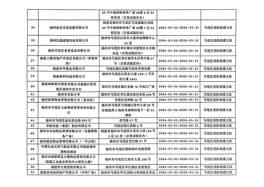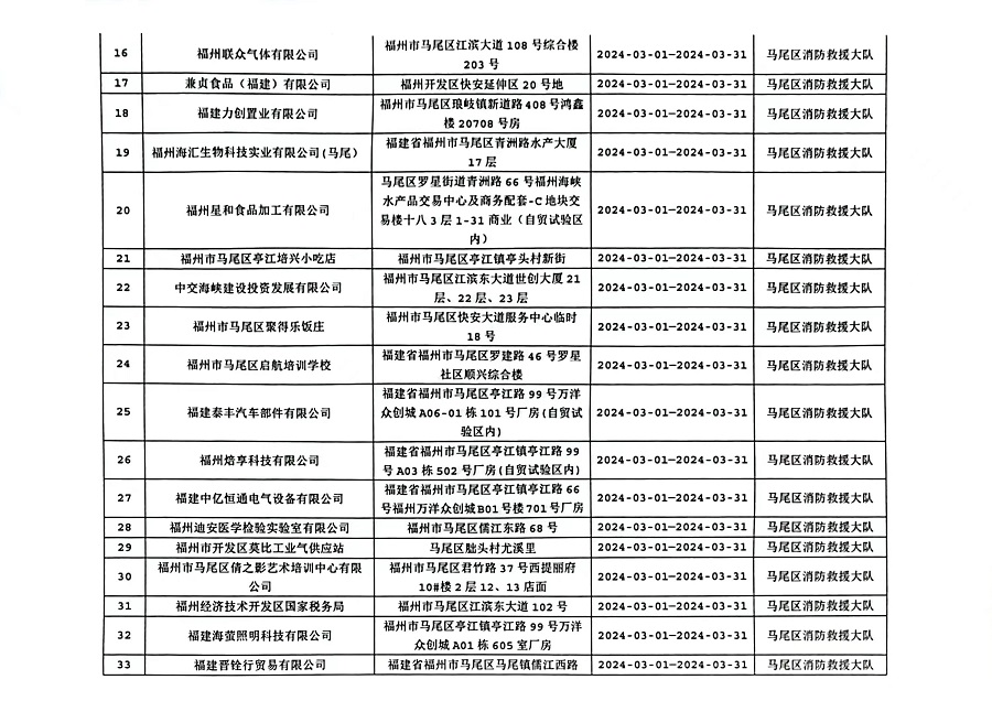 为确保火灾形势持续平稳,全面推行“双随机、一公开”消防监管模式,马尾区消防救援大队3月份对管辖范围内单位履行法定消防安全职责情况进行监督抽查,并定期公示抽查单位和检查结果,提醒社会单位更加自觉履行单位消防安全主体责任,做到“三自主、两公开、一承诺”,即自主评估风险、自主检查安全、自主整改隐患,向社会公开消防安全责任、管理人,并承诺本场所不存在突出风险或者已经落实防范措施等。现按照“双随机、一公开”消防监管工作要求,将3月有关信息公示如下: