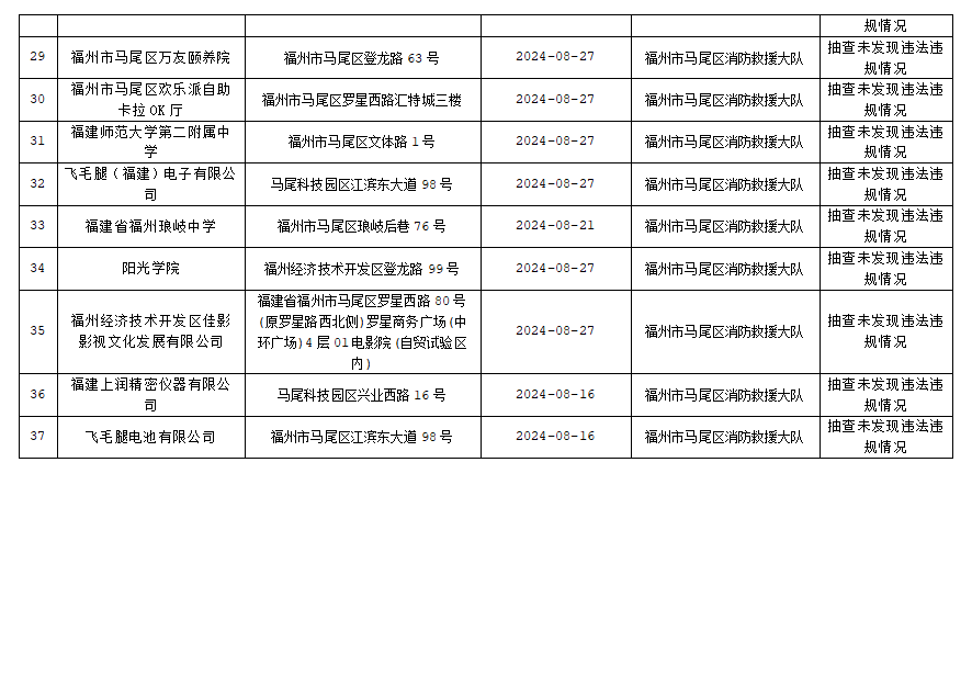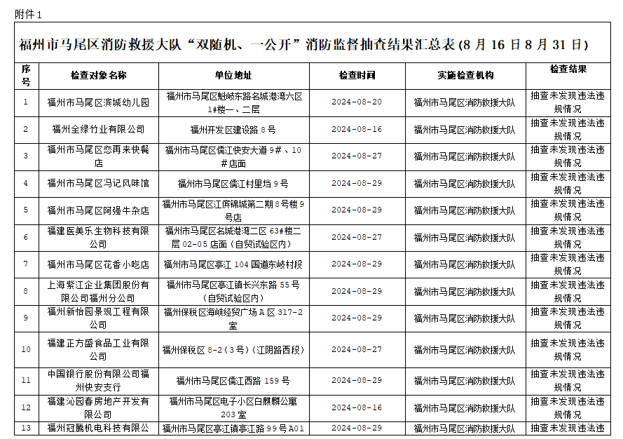 按照福建省消防救援总队《关于开展“双随机、一公开”监督抽查工作的通知》文件要求,2024年8月16日至31日,福州市马尾区消防救援大队对消防监督系统中随机抽取的单位进行了检查,现将检查结果向社会公示,具体抽查结果公示如下: