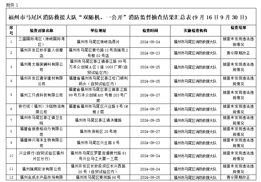 附件:1.福州市马尾区消防救援大队“双随机、一公开”消防监督抽查结果汇总表(9月16日-9月30日)