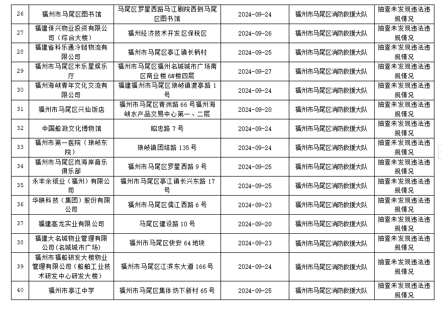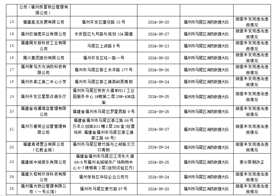 按照福建省消防救援总队《关于开展“双随机、一公开”监督抽查工作的通知》文件要求,2024年9月16日至30日,福州市马尾区消防救援大队对消防监督系统中随机抽取的单位进行了检查,现将检查结果向社会公示,具体抽查结果公示如下: