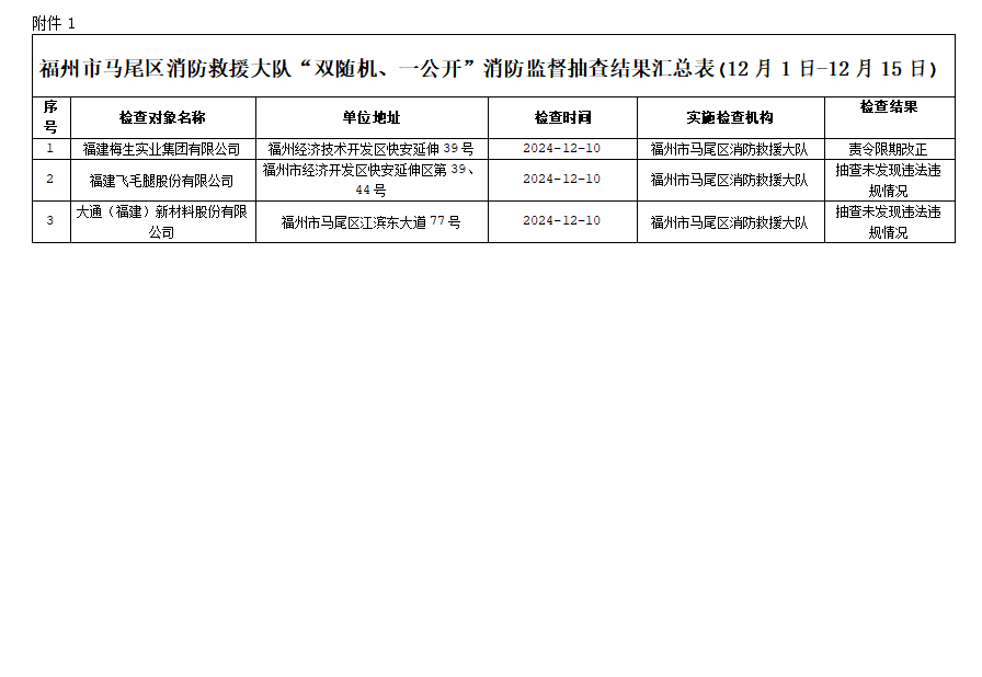 附件:1.福州市马尾区消防救援大队“双随机、一公开”消防监督抽查结果汇总表(12月1日-12月15日)
