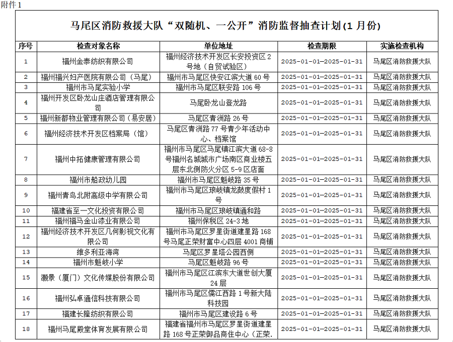 附件: 1. 马尾区消防救援大队“双随机、一公开”消防监督抽查计划(1月份)