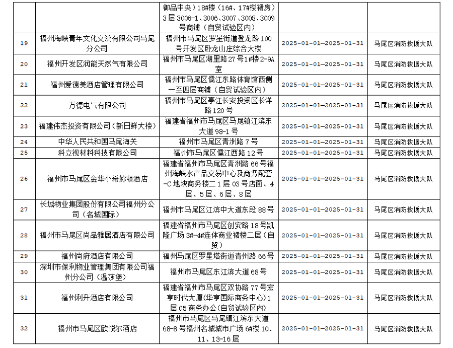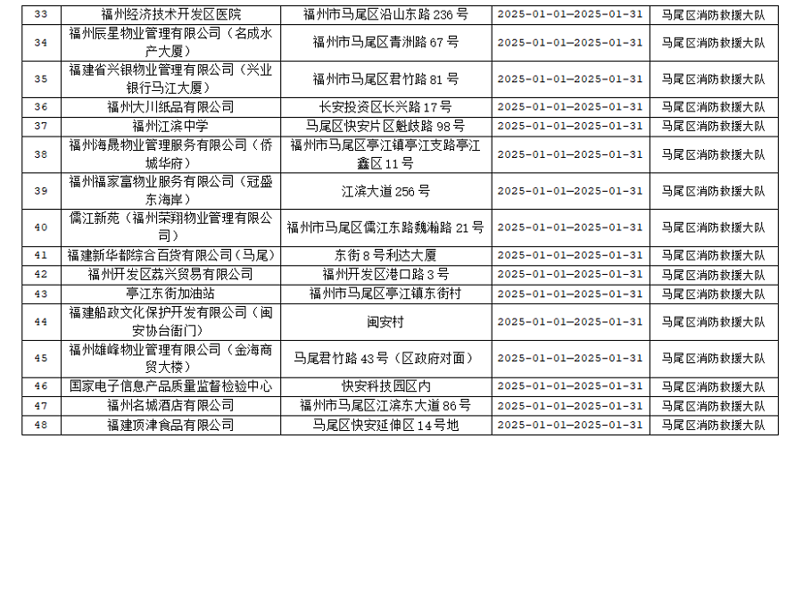 为确保火灾形势持续平稳,全面推行“双随机、一公开”消防监管模式,马尾区消防救援大队1月份对管辖范围内单位履行法定消防安全职责情况进行监督抽查,并定期公示抽查单位和检查结果,提醒社会单位更加自觉履行单位消防安全主体责任,做到“三自主、两公开、一承诺”,即自主评估风险、自主检查安全、自主整改隐患,向社会公开消防安全责任、管理人,并承诺本场所不存在突出风险或者已经落实防范措施等。现按照“双随机、一公开”消防监管工作要求,将1月有关信息公示如下: