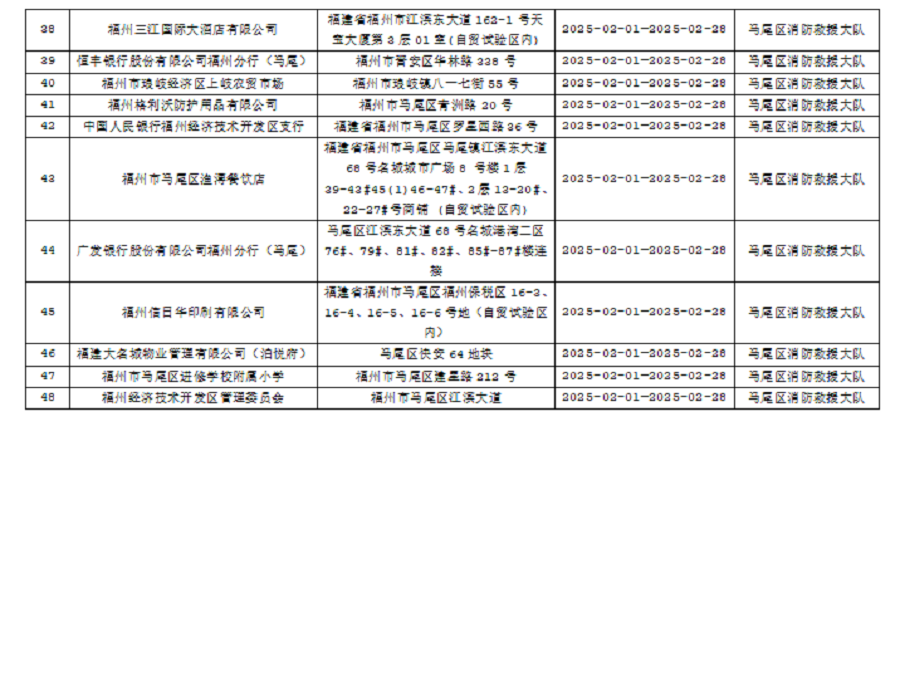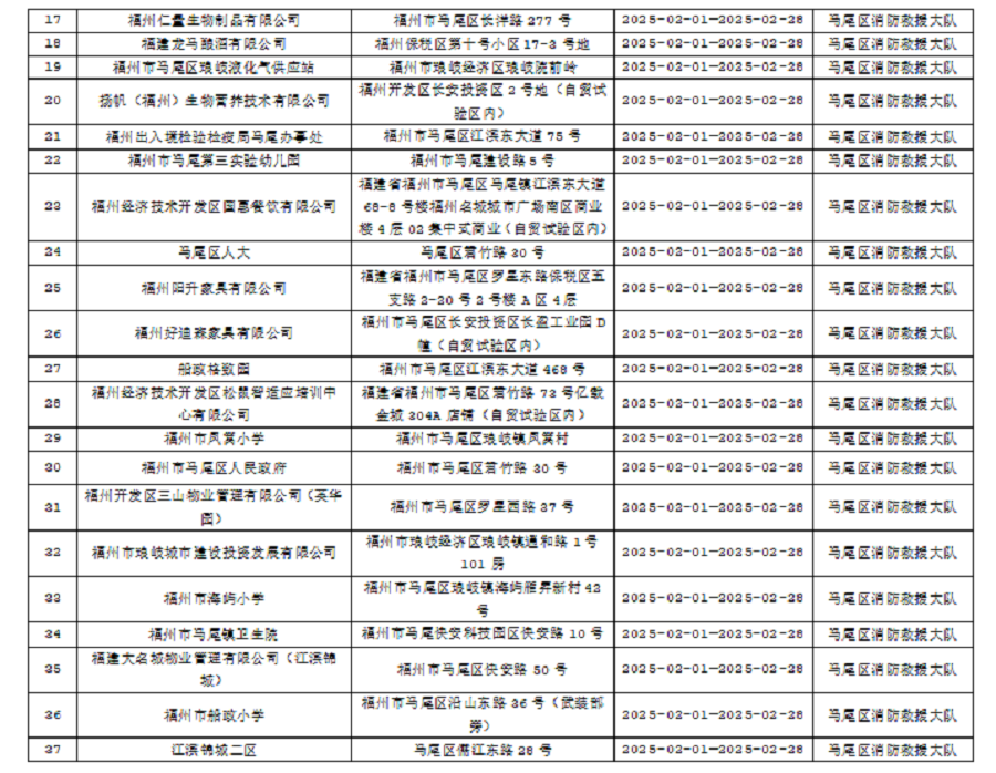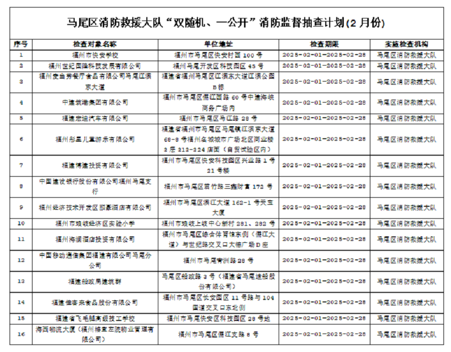 为确保火灾形势持续平稳,全面推行“双随机、一公开”消防监管模式,马尾区消防救援大队2月份对管辖范围内单位履行法定消防安全职责情况进行监督抽查,并定期公示抽查单位和检查结果,提醒社会单位更加自觉履行单位消防安全主体责任,做到“三自主、两公开、一承诺”,即自主评估风险、自主检查安全、自主整改隐患,向社会公开消防安全责任、管理人,并承诺本场所不存在突出风险或者已经落实防范措施等。现按照“双随机、一公开”消防监管工作要求,将2月有关信息公示如下: