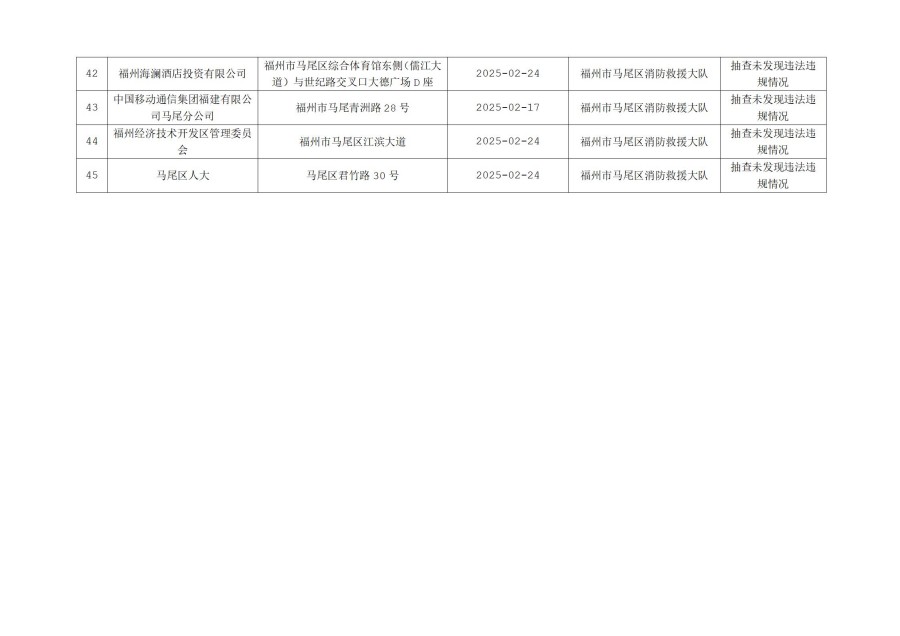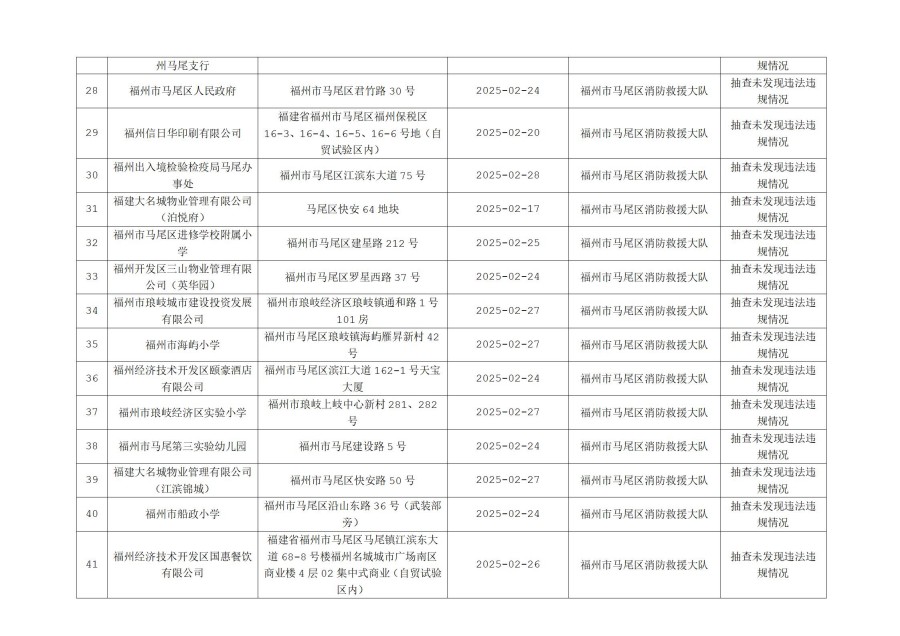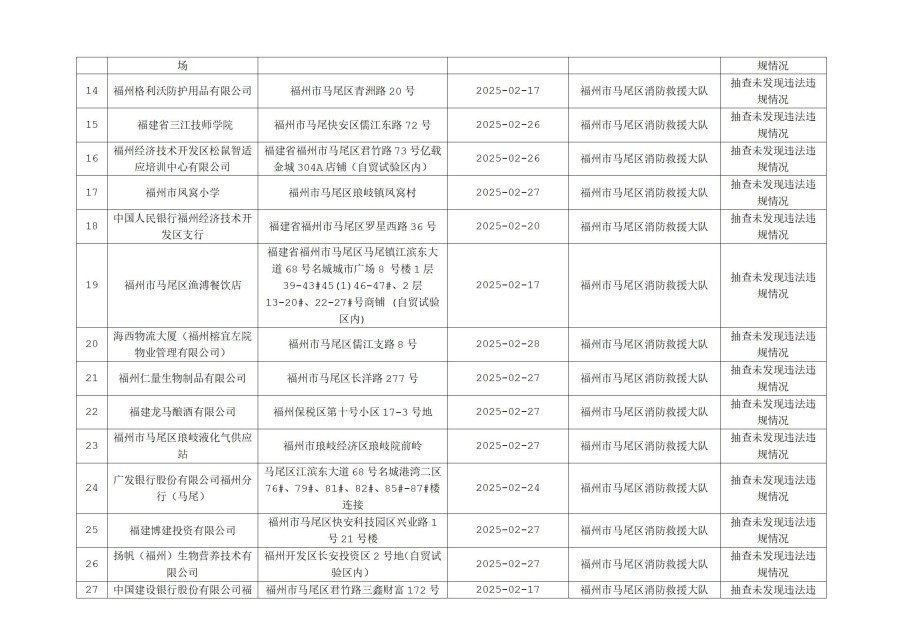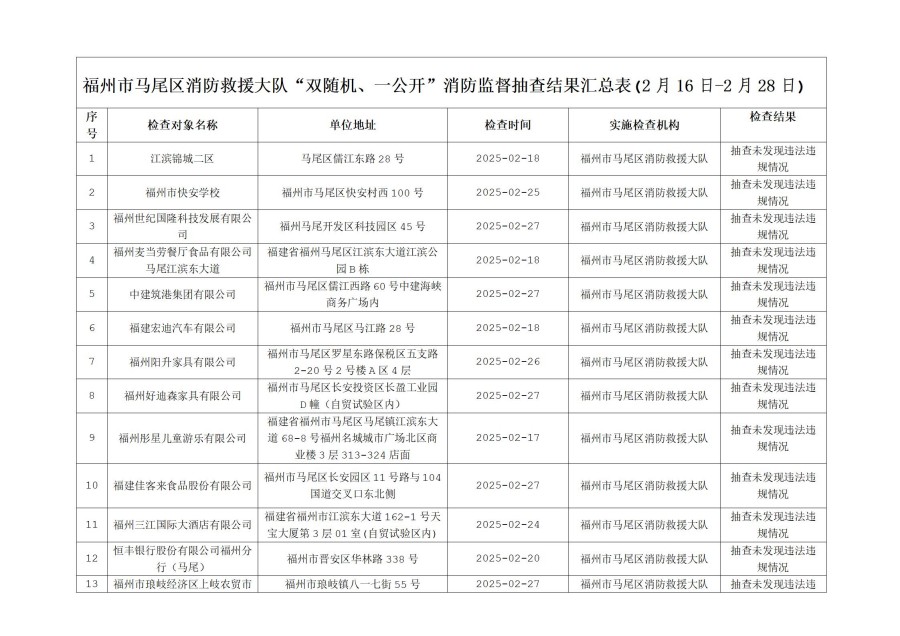 按照福建省消防救援总队《关于开展“双随机、一公开”监督抽查工作的通知》文件要求,2025年2月16日至28日,福州市马尾区消防救援大队对消防监督系统中随机抽取的单位进行了检查,现将检查结果向社会公示,具体抽查结果公示如下: