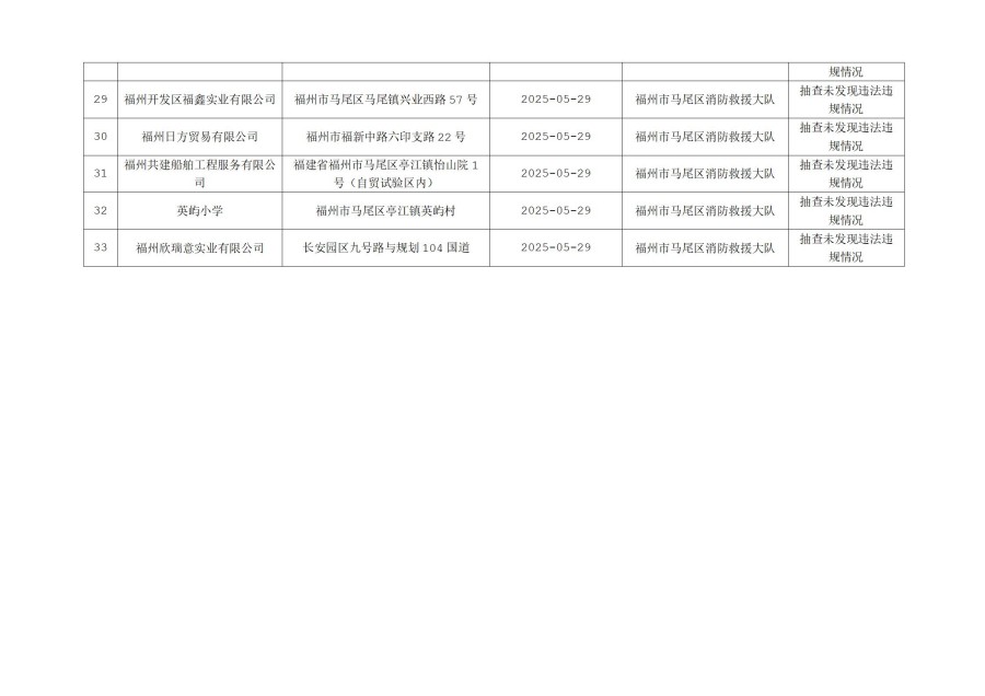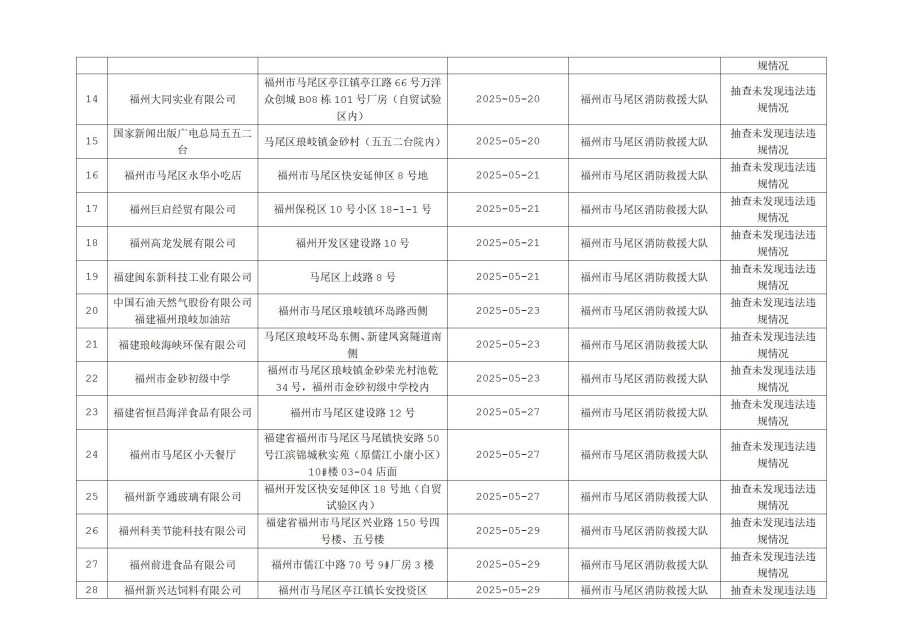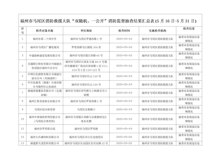 按照福建省消防救援总队《关于开展“双随机、一公开”监督抽查工作的通知》文件要求,2025年5月16日至31日,福州市马尾区消防救援大队对消防监督系统中随机抽取的单位进行了检查,现将检查结果向社会公示,具体抽查结果公示如下: