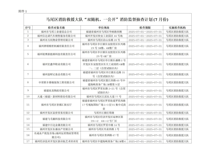 附件: 1. 马尾区消防救援大队“双随机、一公开”消防监督抽查计划(7月份)