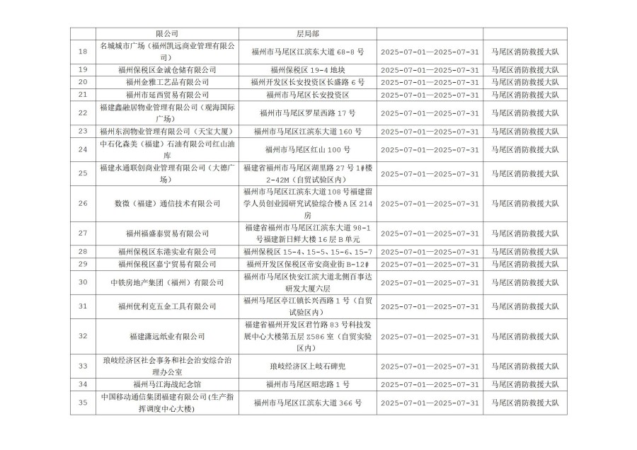 为确保火灾形势持续平稳,全面推行“双随机、一公开”消防监管模式,马尾区消防救援大队7月份对管辖范围内单位履行法定消防安全职责情况进行监督抽查,并定期公示抽查单位和检查结果,提醒社会单位更加自觉履行单位消防安全主体责任,做到“三自主、两公开、一承诺”,即自主评估风险、自主检查安全、自主整改隐患,向社会公开消防安全责任、管理人,并承诺本场所不存在突出风险或者已经落实防范措施等。现按照“双随机、一公开”消防监管工作要求,将7月有关信息公示如下: